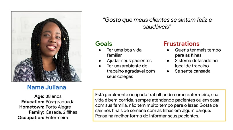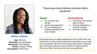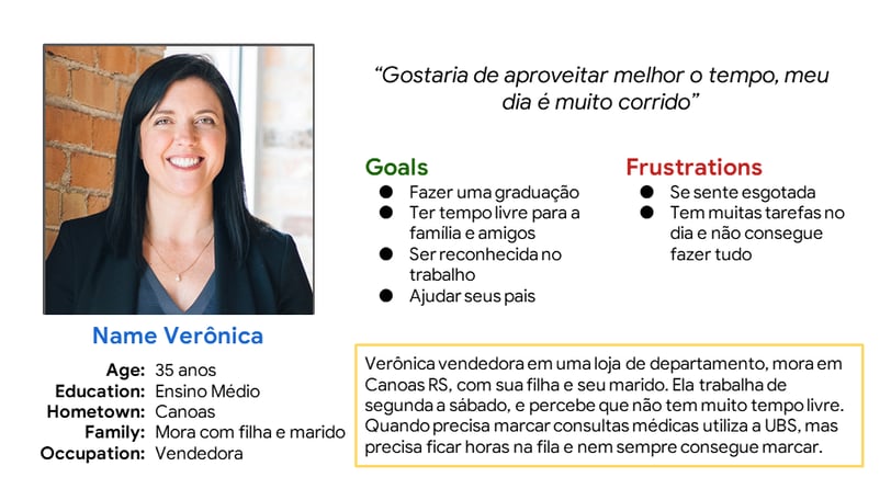 Personas são representações semifictícias do nosso cliente ideal, baseadas nas pesquisas e dados. Elas ajudam a entender melhor o público-alvo. Foram definidas características, objetivos, frustrações e necessidades da persona.