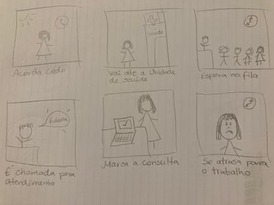 Um storyboard é uma ferramenta essencial na pré-produção de projetos. Consiste em ilustrações que mostram a sequência das cenas e seus personagens. Através do storyboard, é possível organizar e comunicar as ideias de forma visual, facilitando o planejamento e economizando tempo e recursos. A primeira imagem é sobre o momento atual em que o usuário precisa esperar na fila da UBS. A segunda imagem monstra a solução de marcar a consulta online. Com isso, podemos obter feedbacks, garantindo a eficiência e qualidade do projeto final, ajudando a transformar conceitos abstratos em uma realidade palpável.