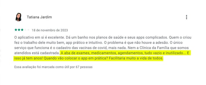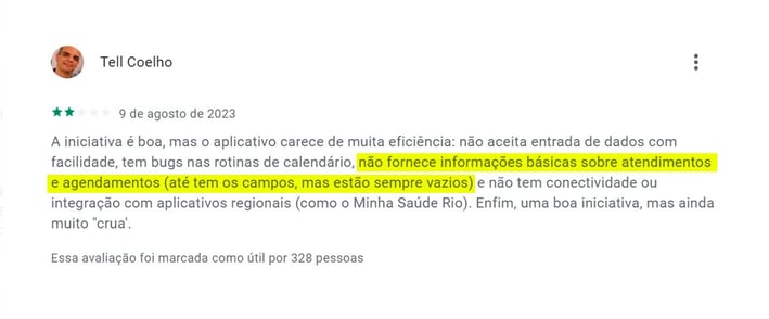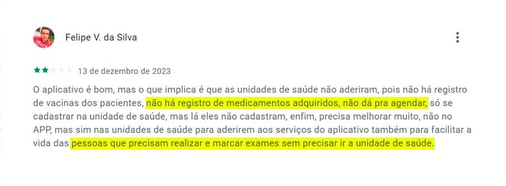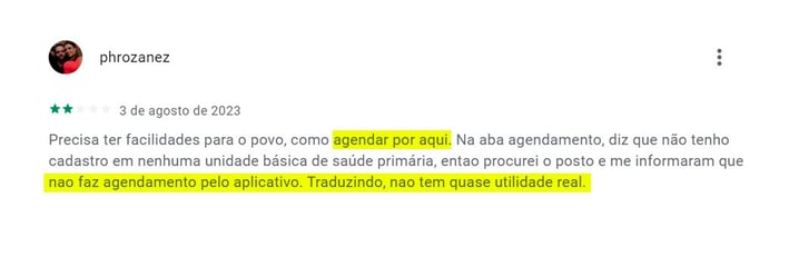 As mensagem a seguir foram retiradas da App Store e Google Play. Muitos usuários têm expressado sua insatisfação com o aplicativo do governo ConecteSUS. Entre as principais reclamações, destaca-se a dificuldade em agendar consultas médicas e a impossibilidade de visualizar resultados de exames. Essa situação tem gerado grande frustração e descontentamento entre os usuários, que buscam utilizar o aplicativo como uma forma de facilitar o acesso aos serviços de saúde oferecidos pelo governo.